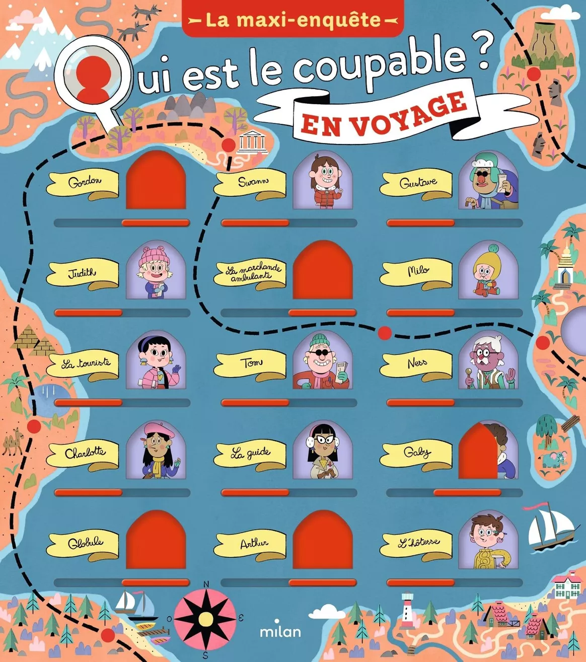 « Qui est le coupable ? » en version maxi-enquête avec un voyage autour du monde en 4 étapes, 32 enquêtes et 4 fiches de 15 personnages à glisser dans la couverture.