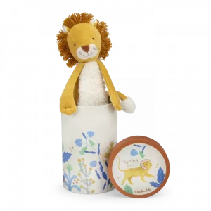 Le gentil lion Mamba est tout le temps disponible pour une séance de câlins. Sa jolie crinière et sa belle fourrure blanche en font un vrai copain pour les tout-petits. Il loge dans une boîte joliment illustrée à l’aquarelle par Élodie Coudray.