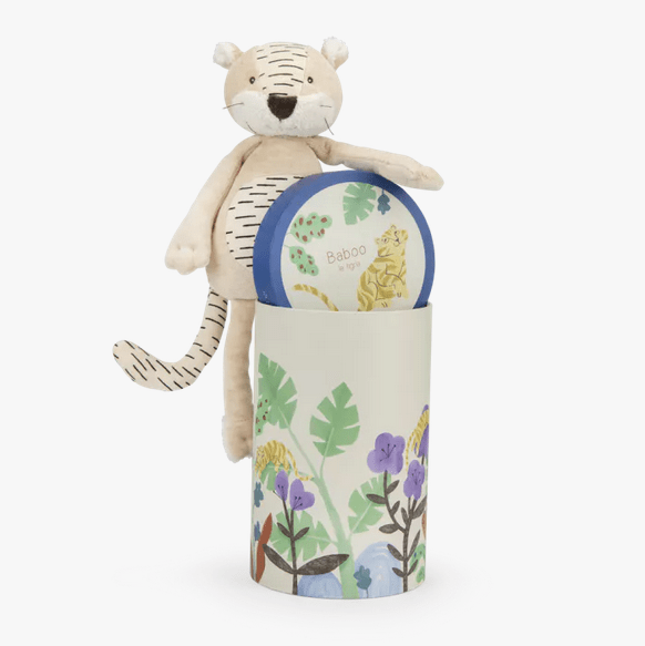 Baboo, le tigre un brin paresseux, est toujours prêt à se faire câliner. Tout en rondeur avec sa fourrure crème et ses rayures graphiques, il sera le partenaire idéal des enfants. Il loge dans une boîte joliment illustrée à l’aquarelle par Élodie Coudray.